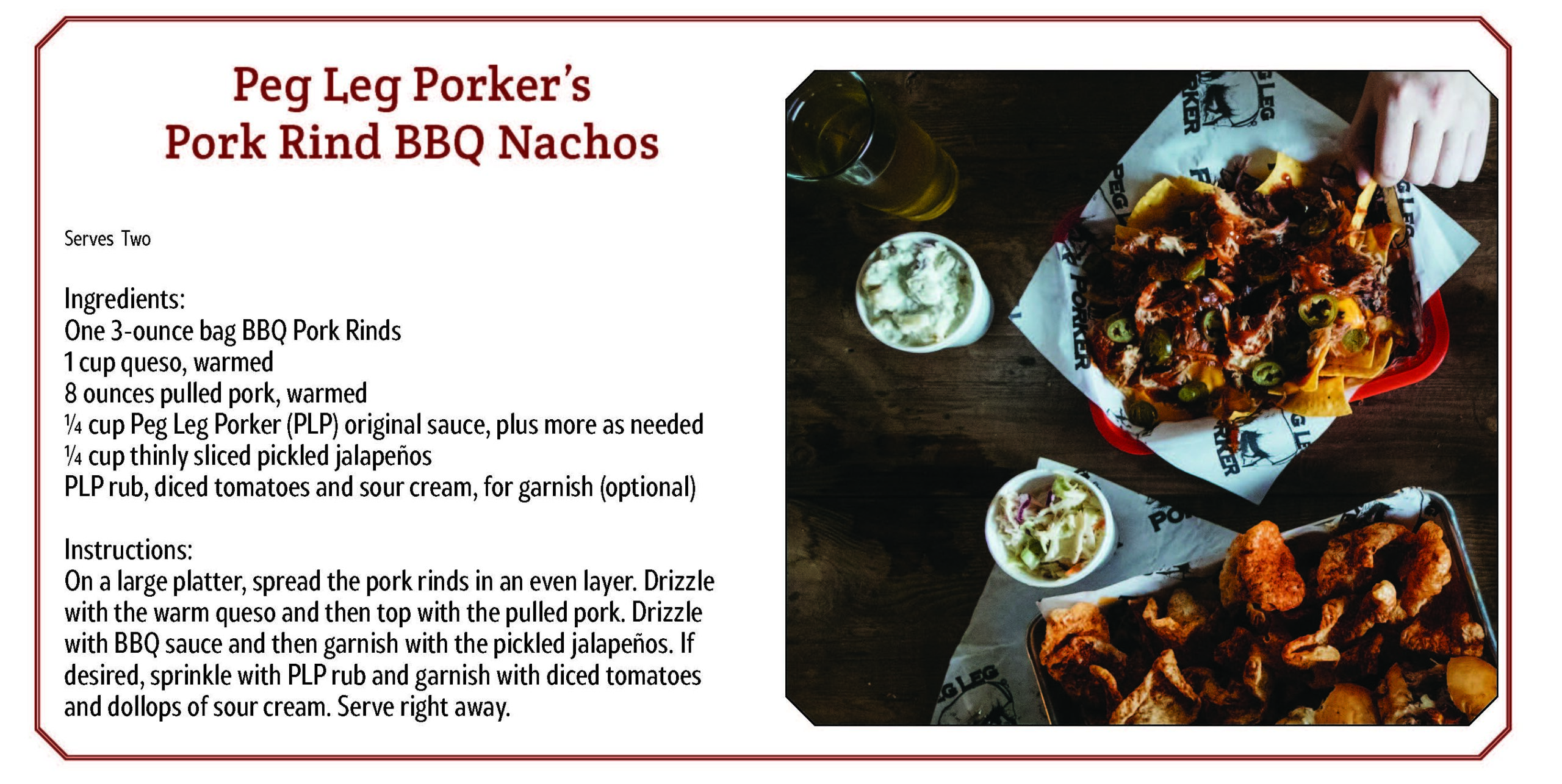Peg Leg Porker is known for its juicy, smoked-to-perfection pork ribs drenched with a spicy dry seasoning, after, being smoked. Made from scratch, playfully made sides include Kool-Aid pickles and pork rind nachos.